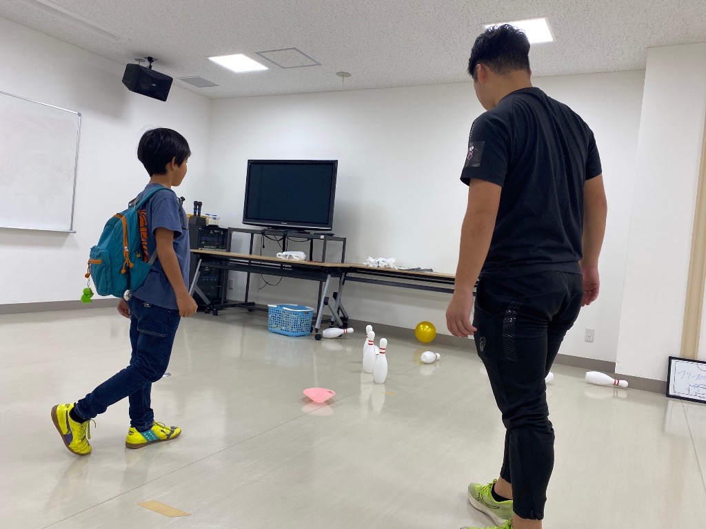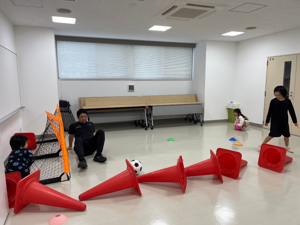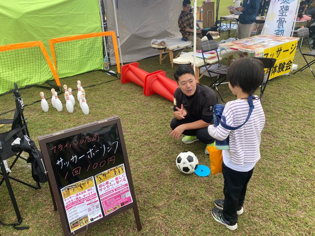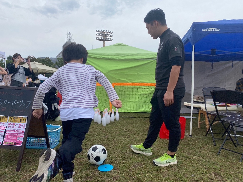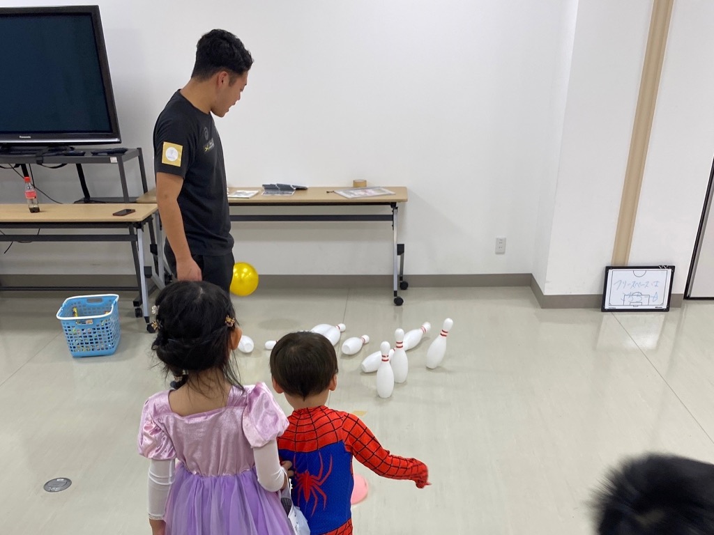 ハロウィンイベントということで可愛い仮装をした子どもたちと一緒にサッカーしました。またサッカーボーリングでお菓子をGETし、楽しんでもらえることができました。